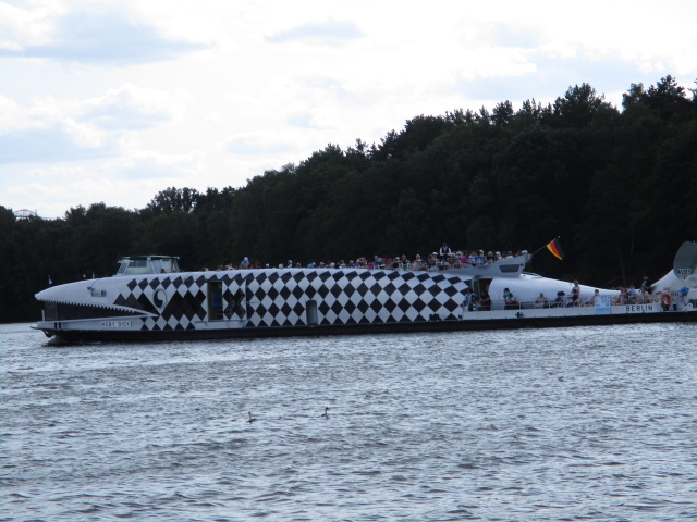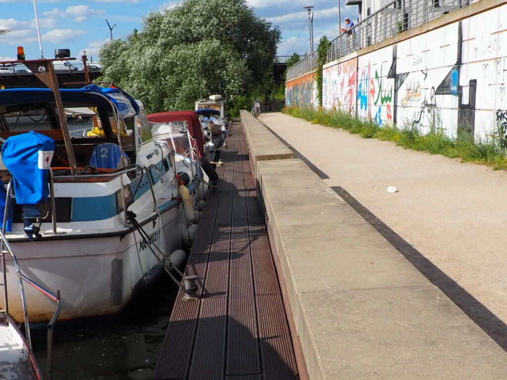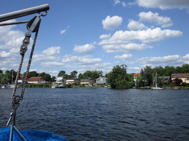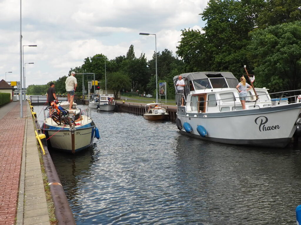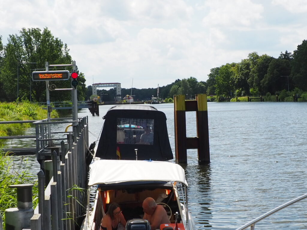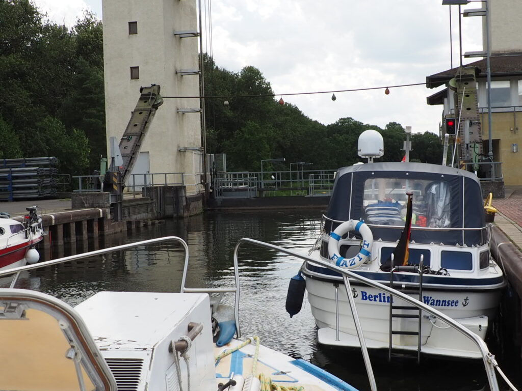 Dopłynęliśmy do Berlina. Po drodze była śluza Lehnitz. Przejście przez nią trwało 2 godziny, bo jest duży ruch. Gdy dopłynąłem do śluzy były tam dwie jednostki. Potem dopłynęły dalsze. Na zdjęciu widać napis parking dla łodzi sportowych śluza Lehnitz i czerwone światło. Gdy się otworzyła ( nie było żadnej korespondencji ) wypłynęło z niej 24 jednostki i kajak. Na zdjęciach widać nas w śluzie. Zanim to całe towarzystwo wpłynie i zacumuje, musi trwać. W Berlinie zacumowaliśmy przy takim miejskim nabrzeżu dla łodzi sportowych w Spandau pomiędzy mostami. Można tu stać bezpłatnie do 24 godzin. Po drodze bardzo malownicze widoki w okolicach Oranienburga i przed Berlinem.