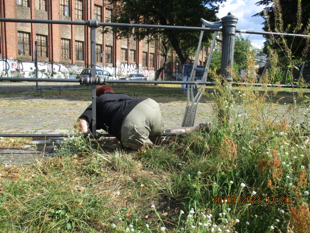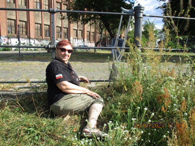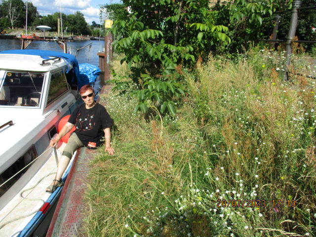 Dziś właściwie, to przepłynęliśmy tylko przez śluzę Spandau i stoimy przy nabrzeżu po drugiej stronie śluzy. Nabrzeże trochę zaniedbane, stąd Galina wychodzi, tak, jak na zdjęciu. Ale właśnie dziś przyjechała koparka i zaczęła czyścić nabrzeże.