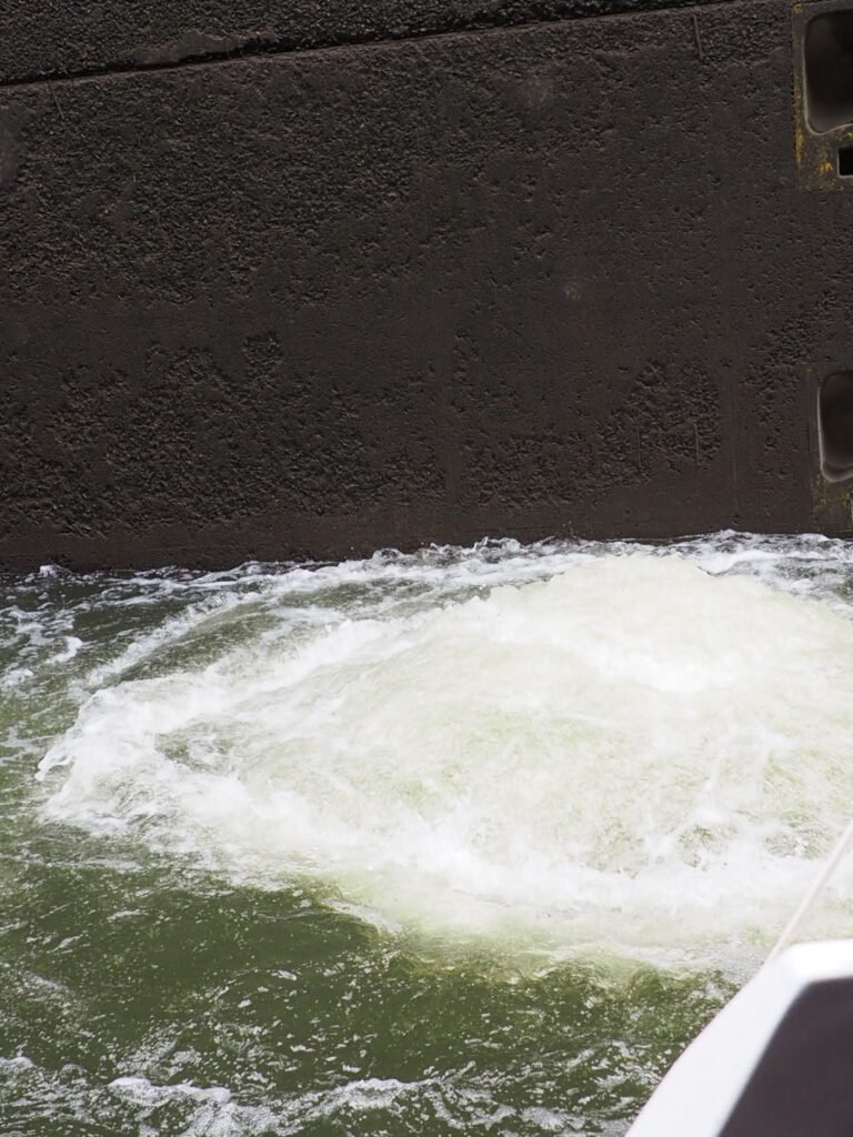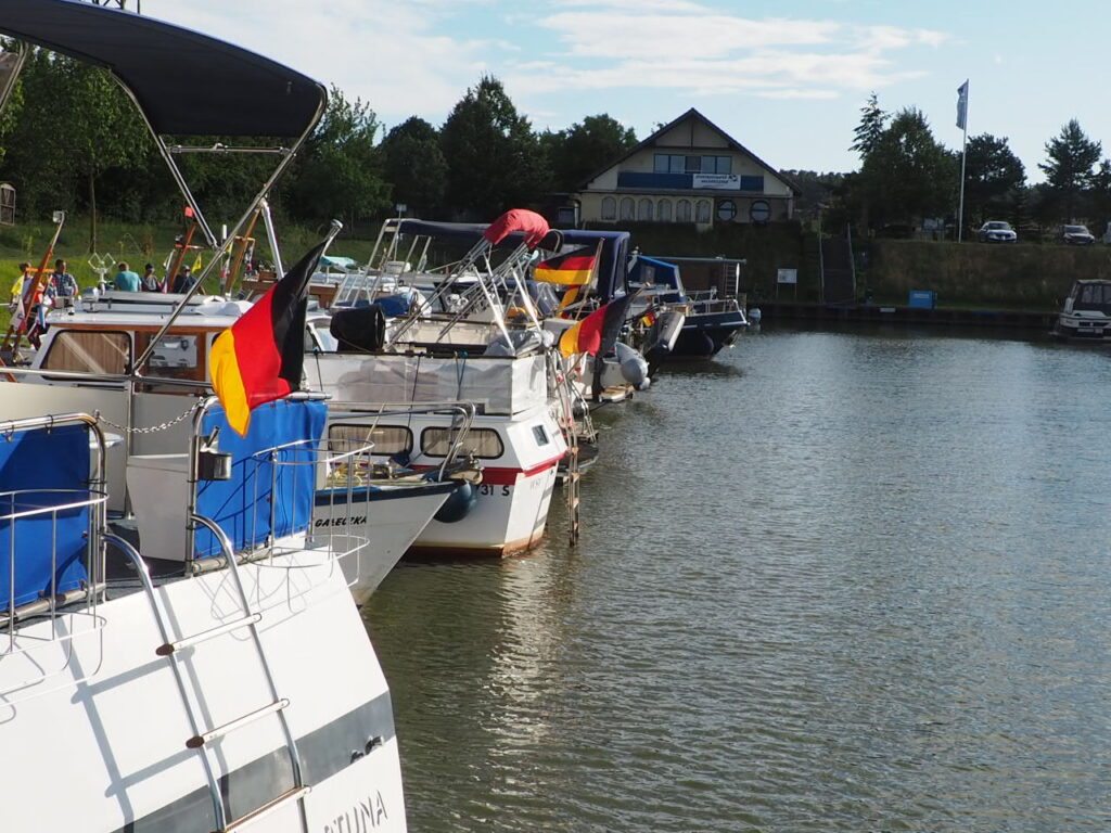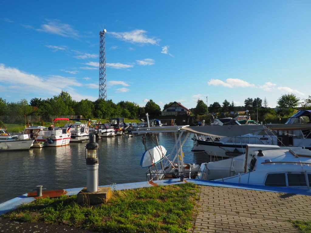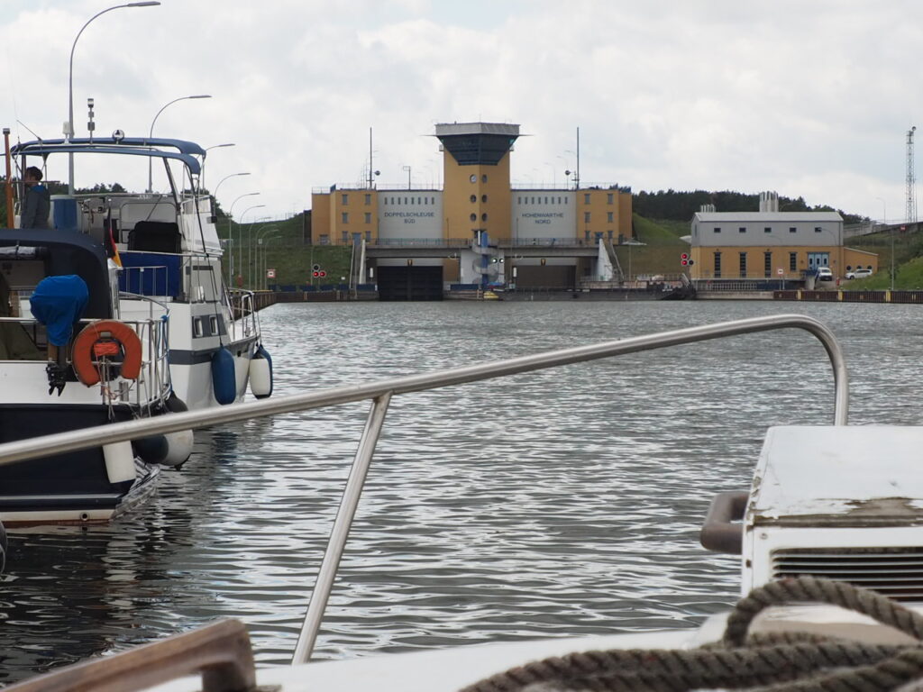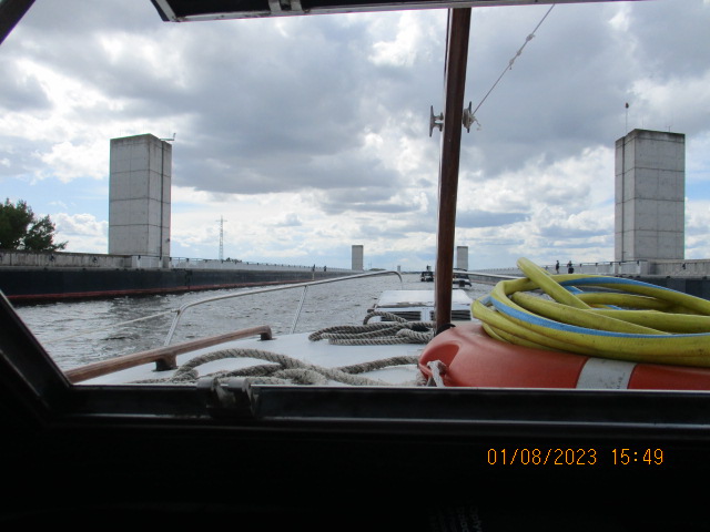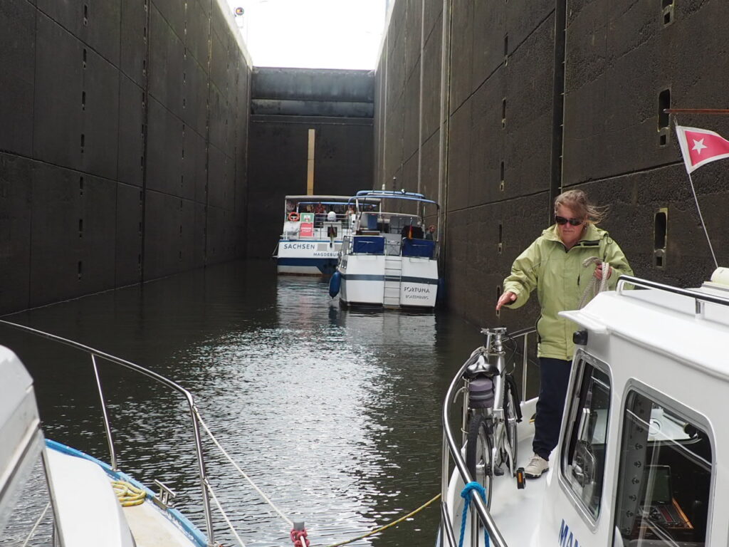 Aby tu dopłynąć trzeba było przejść przez 20 m śluzę Hohenwarthe i najdłuższy w Europie akwadukt w pobliżu Magdeburga. Śluza przetrzymała nas ponad godzinę i zawróciła mi w głowie, bo czekaliśmy na statek pasażerski, który wypłynął jakby ze śluzy z Elby z Magdeburga, czyli tak, jakby była tam żegluga. Ale więcej planów nie zmieniam. Za pasażerem wpuszczono nas. Niestety, żaden z oczekujących ze mną Niemców nie znał angielskiego. Starali mi się wytłumaczyć że 8 nie. Myślałem, że wpuszczą tylko 7 statków, ale było nas tam 5. Pani tłumaczyła, że 9 i 10 tak, ale 8 nie. Dopiero w śluzie zorientowałem się, są tam pływające polery i 8 nie działa. Przygotowałem się do przekładania cumy coraz wyżej, ale śluzowi uparli się, że wszyscy muszą stać przy pływających polerach, a że nie było już wolnych, więc mam stać przy burcie innej łodzi. Tylko, że gadali to po niemiecku. Na szczęście załogi wiedziały, że jestem cudzoziemcem i wymachując rękoma wysterowały mnie ku zadowoleniu śluzowych. A sama śluza robi wrażenie. Przed wpłynięciem na akwadukt trzeba się zarejestrować, bo łodzie płyną w konwoju raz w jedną, raz w drugą stronę. Ponieważ jednak śluza zgromadziła nas 5 statków i znalazłem się dokładnie w środku, postanowiłem obserwować co zrobią inni. Inni po prostu wpłynęli na akwadukt i jak między nimi. Może rozmawiali na wymaganej częstotliwości i powiedzieli, że płynę w środku, ale nie słyszałem. Akwadukt , niestety, już wrażenia nie robi bo ma na tyle wysokie brzegi, że nic nie widać. Ale powyżej brzegów jest droga i tam gromadzi się sporo gapiów. W dole płynie Elba. Marina w Haldensleben ładna, tania 15 euro. w cenie tylko prąd. Woda 1 euro/100 l. Natrysk 1 euro/4 min. – mamy swój. Zakupy zdążyliśmy zrobić w Burgu przed wypłynięciem.