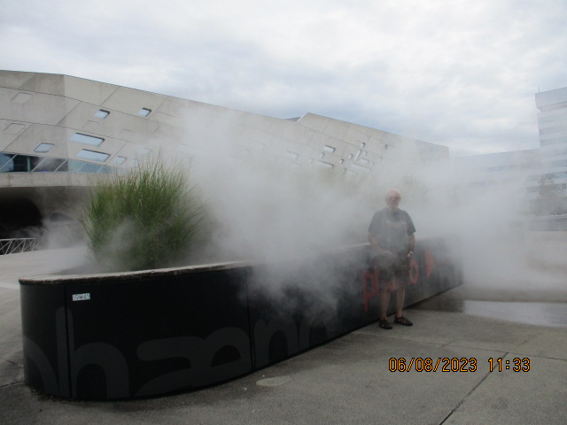 Dziś przeszliśmy centrum miasta. Galina zrobiła mi zdjęcie przy donicy z roślinami podlewanej metodą mgły wodnej.