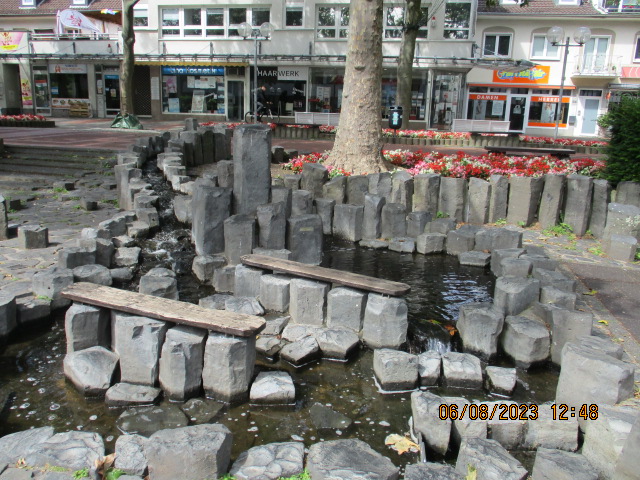 A na tym zdjęciu jest fontanna, która ma ławeczki, aby posiedzieć z stopami w wodzie.