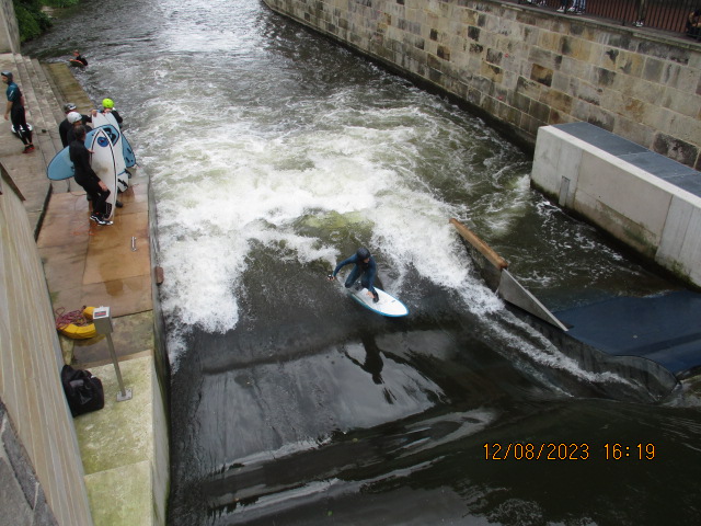 W środku miasta jest taka zabawka. Wyprofilowano wodospad na strumyku i można trenować surfing. Stoi kolejka chętnych.