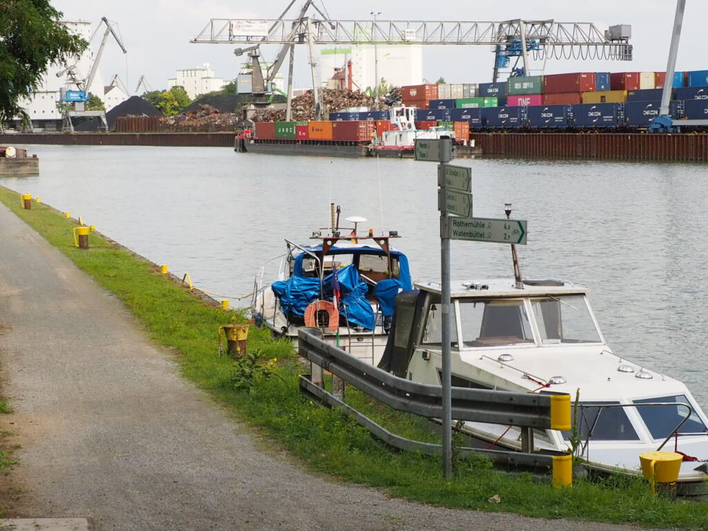 Przypłynęliśmy do Braunschweigu, ale tym razem stoimy bezpłatnie, przy nabrzeżu, na skraju portu towarowego. Jest wyznaczone miejsce dla małych łodzi. Niestety bardzo tu kołysze, bo brzegi są umocnione i fale odbijają się. Myślę, że pod wieczór, gdy ustanie ruch, to się uspokoi.
