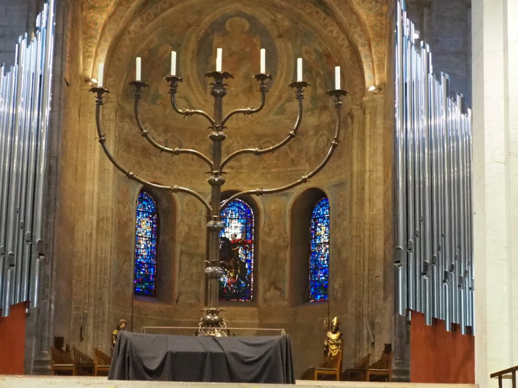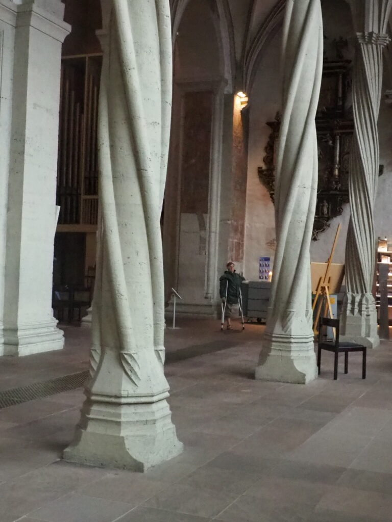 Płynąc z powrotem uzupełniamy to, czego nie zobaczyliśmy wcześniej. Katedra w Braunschweigu słynie z ogromnego siedmioramiennego świecznika. Budowla jest romańska, ale jedną nawę dobudowano później i zastosowano tu takie spiralne kolumny.