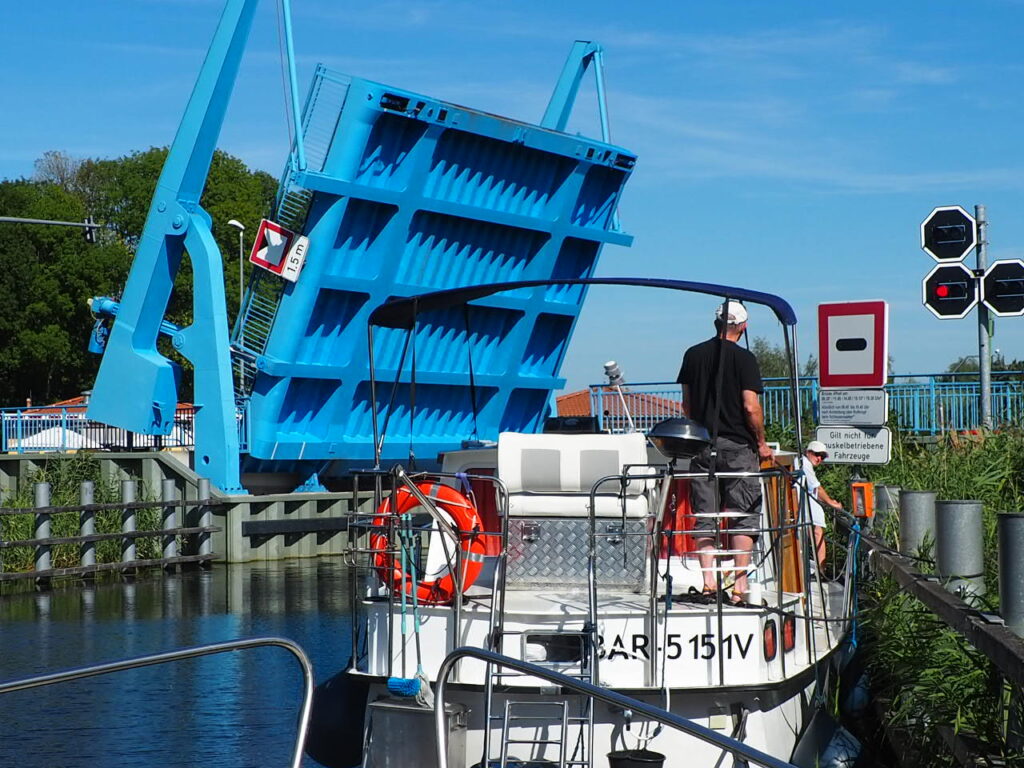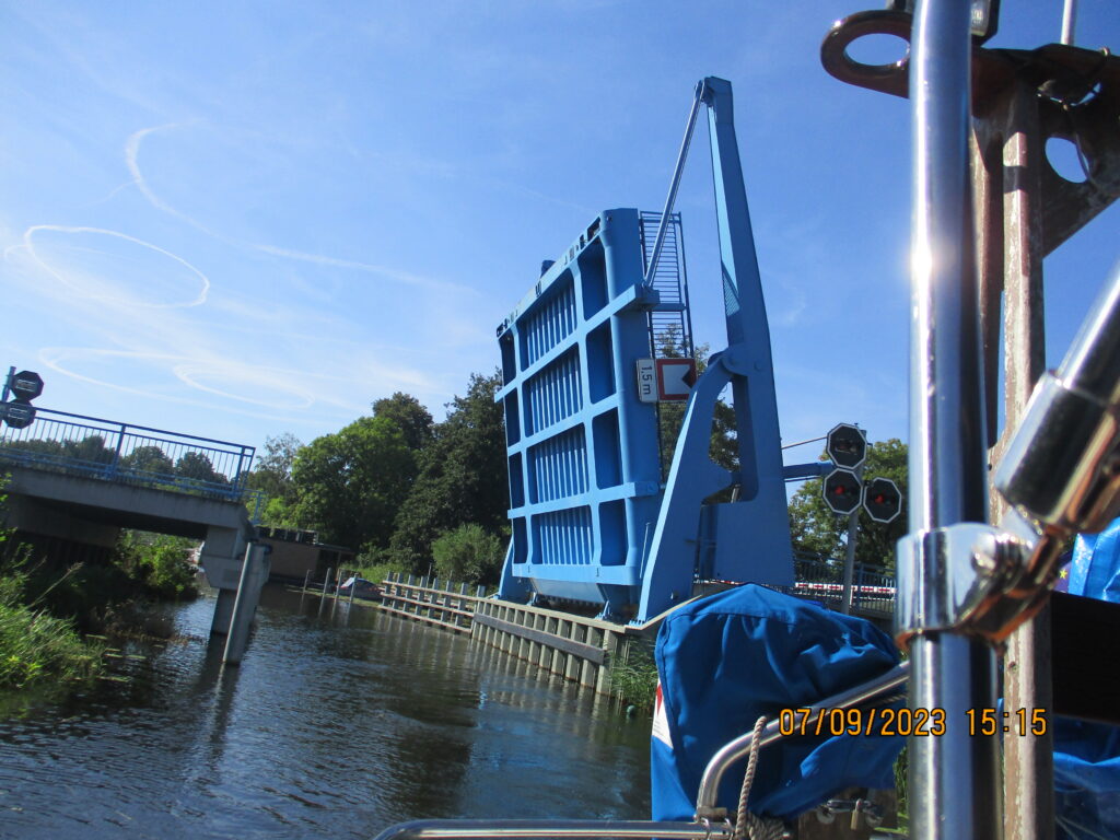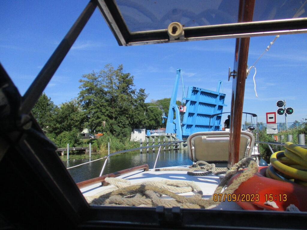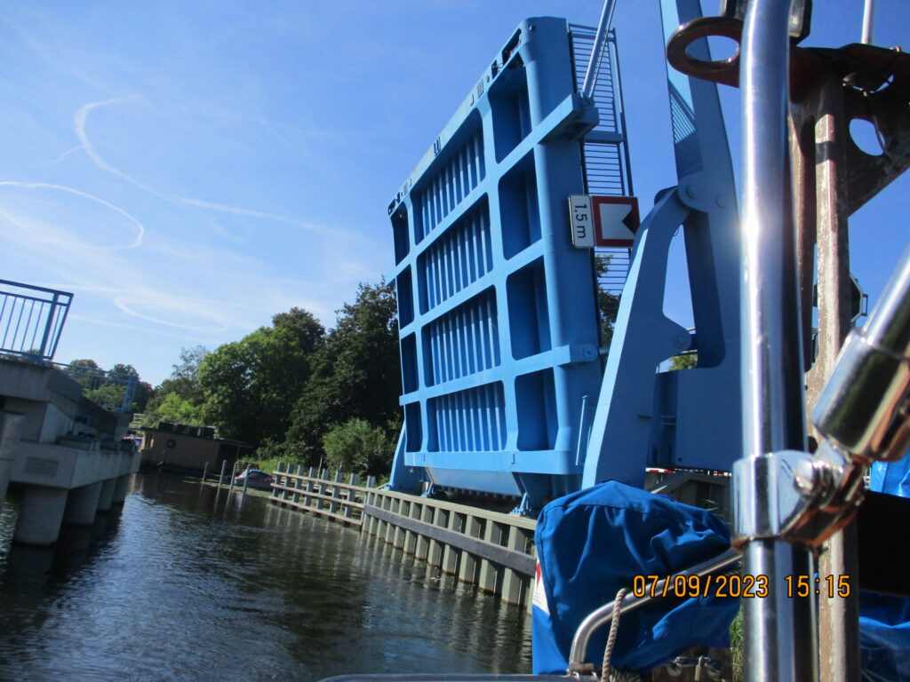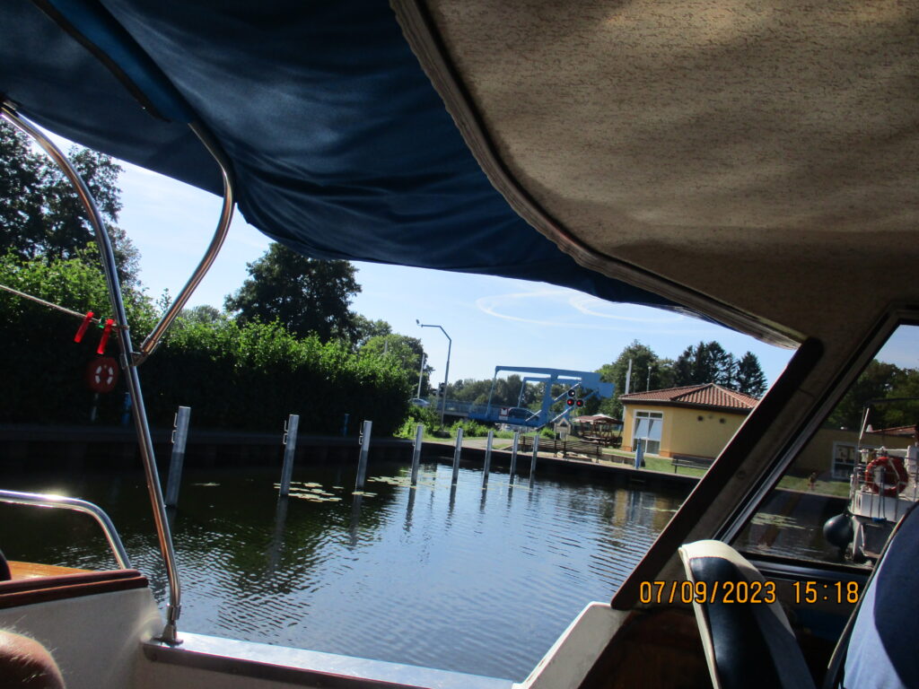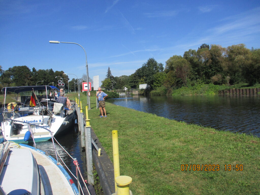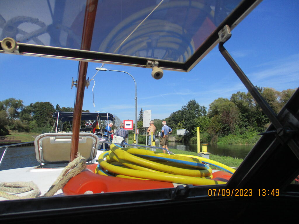 Dziś zrobiło się bardziej staroświecko. Na Obere-Havel-Wasserstrase nie ma map GPS, trzeba więc śledzić mapę papierową. W dodatku jest tu szereg innych atrakcji. Za Oranienburgiem przepłynęliśmy bez kłopotu śluzę Lehnitz a po skręceniu w OHW dopłynęliśmy do śluzy Liebenwalde, samoobsługowej. Przed nami dopłynęła tu już jedna łódka. Panowie z niej znali zasady obsługi. To podobnie, jak było we Francji. Na stanowisku oczekiwania jest dźwignia do przekręcenia, która otwiera śluzę od strony oczekujących. Po wpłynięci i zacumowaniu przekręca się drugą dźwignię, która jest na nabrzeżu wewnątrz śluzy. Chwilę po jej pokonaniu byliśmy w Liebenwalde, ale okazało się, że w „pierwszej” marinie nie ma miejsca i trzeba wpłynąć do „drugiej” za mostem zwodzonym. Most otwiera się o wyznaczonych godzinach, przyszło znowu trochę poczekać, wreszcie wpłynęliśmy do przedziwnej mariny. Opowiem o niej jutro, jak zrobię zdjęcia.