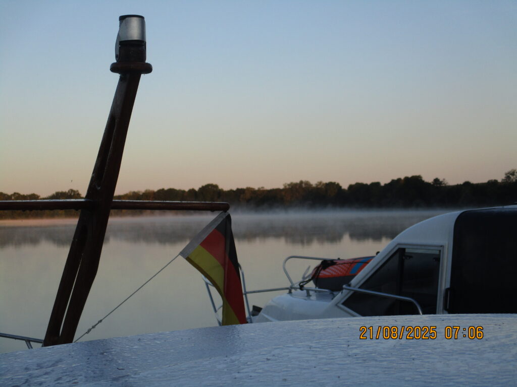 Początkowo planowałem nocować na kotwicy na przeciwko tej mariny, ale teraz myślę, że stoimy tu do rana. Nie ma żadnych udogodnień (WC, prąd, woda, natrysk ), więc chyba nikt po żadną opłatę nie przyjdzie. Za to rano w Priepert oddali mi 13 euro. Podobno nie wszystko wykorzystałem.